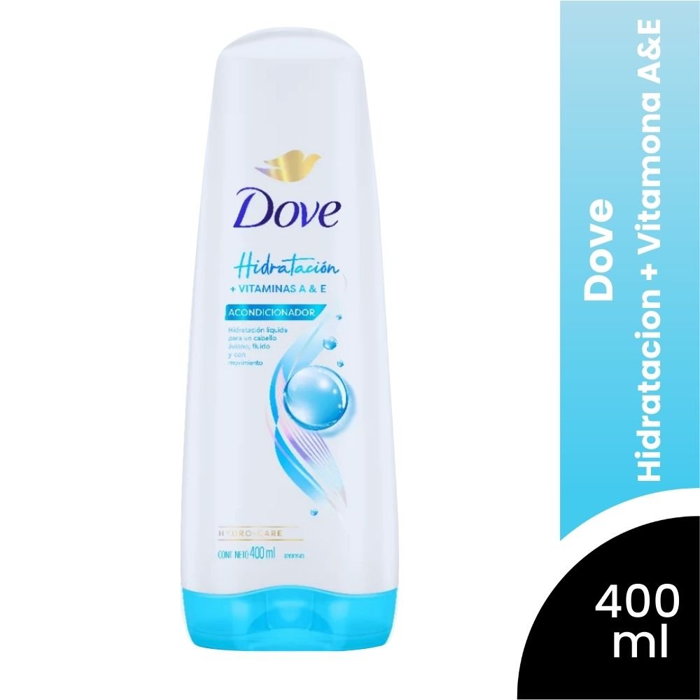 • Acondicionador Dove Hidratación + Vitaminas A&E, hidratación liviana para un pelo liviano, fluido y con movimiento.