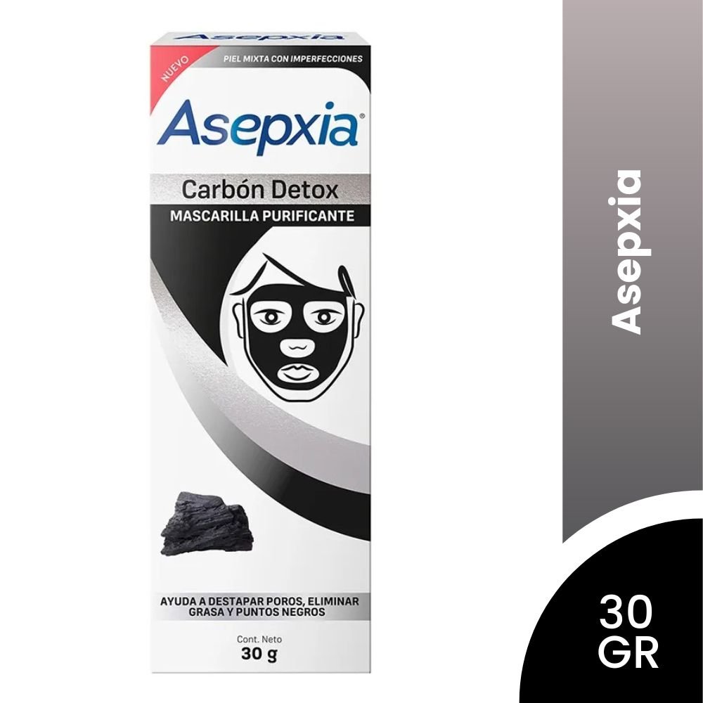 • La Asepxia Carbón Detox Mascarilla x 30 g es un tratamiento facial diseñado para limpiar profundamente la piel, gracias a su fórmula con carbón activado que ayuda a absorber la grasa, remover impurezas y destapar los poros.