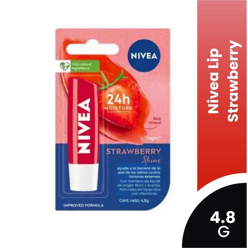 • Nivea Lip Care Fresa es un bálsamo labial que combina el delicioso aroma a fresa con una fórmula enriquecida con aceites naturales y manteca de karité, ofreciendo hidratación intensa y prolongada.