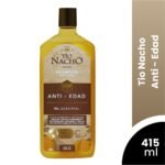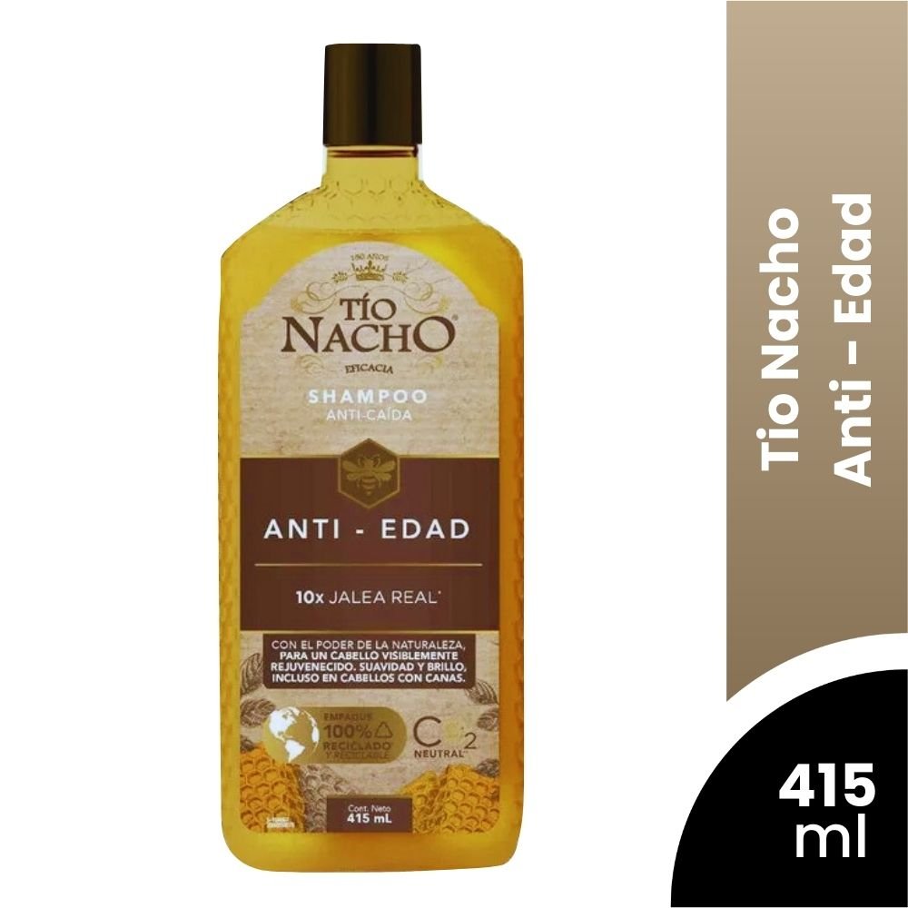 • El Shampoo Tío Nacho Anti-Edad combina la potencia nutritiva de la jalea real con una selección de extractos naturales como romero, bardana, aloe vera, jojoba, espinosilla y en algunas versiones también cacahuananche, que actúan para fortalecer e hidratar la fibra capilar, reducir signos del envejecimiento capilar como la fragilidad y la pérdida de brillo